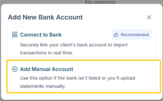 ⚠️ Note: It must be a manually created bank account. If you use an account already connected to the bank, it will generate a duplication of transactions: on one hand, those you import from uploaded bank statements, and on the other, those sent directly by the bank.